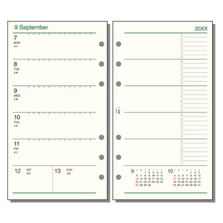 日付入、左ページ1週間スケジュール、右ページメモ、チェックリスト付。