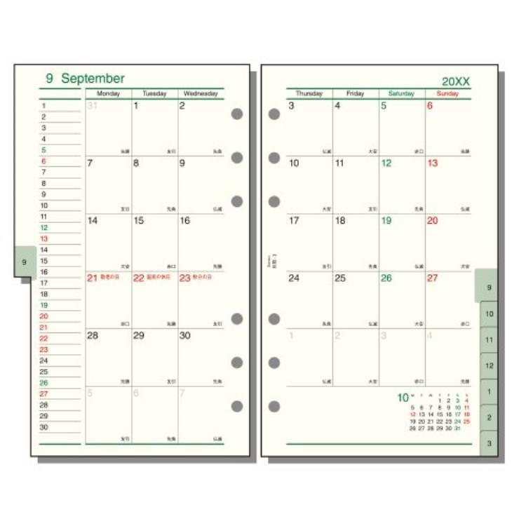 見開き両面1ヶ月ブロック式、月曜始まり インデックス付き。