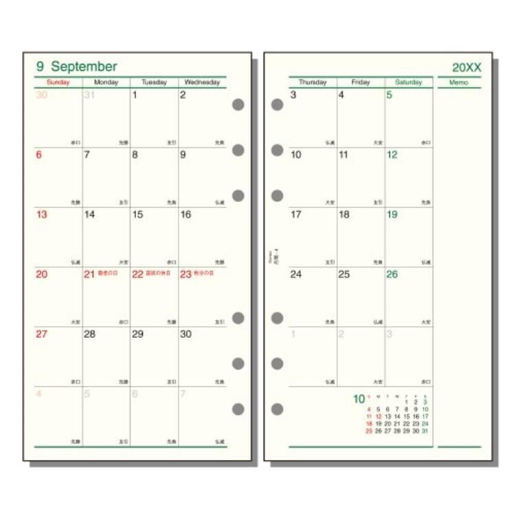 見開き両面1ヶ月ブロック式、日曜始まり。
