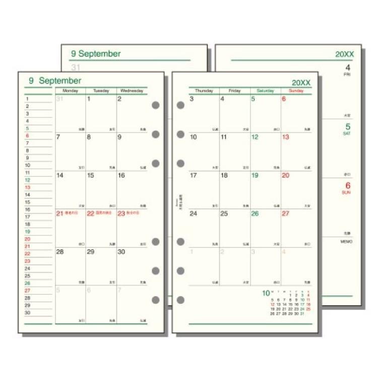 見開き両面1ヶ月ブロック式 &見開き両面1週間 日付入、スケジュールを使い分けられるタイプです。