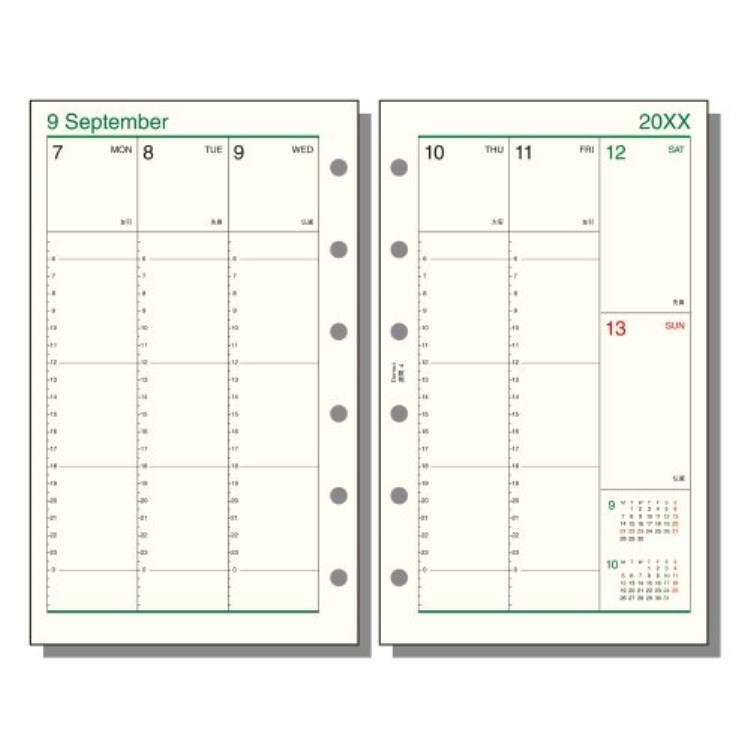 見開き両面1週間・時間目盛り付き、縦型平日重視。
