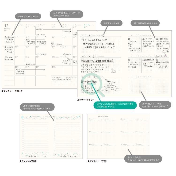 日付け入りマンスリーと日付けなしデイリーのハイブリット構成が特長。