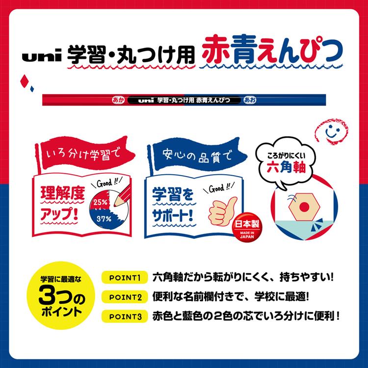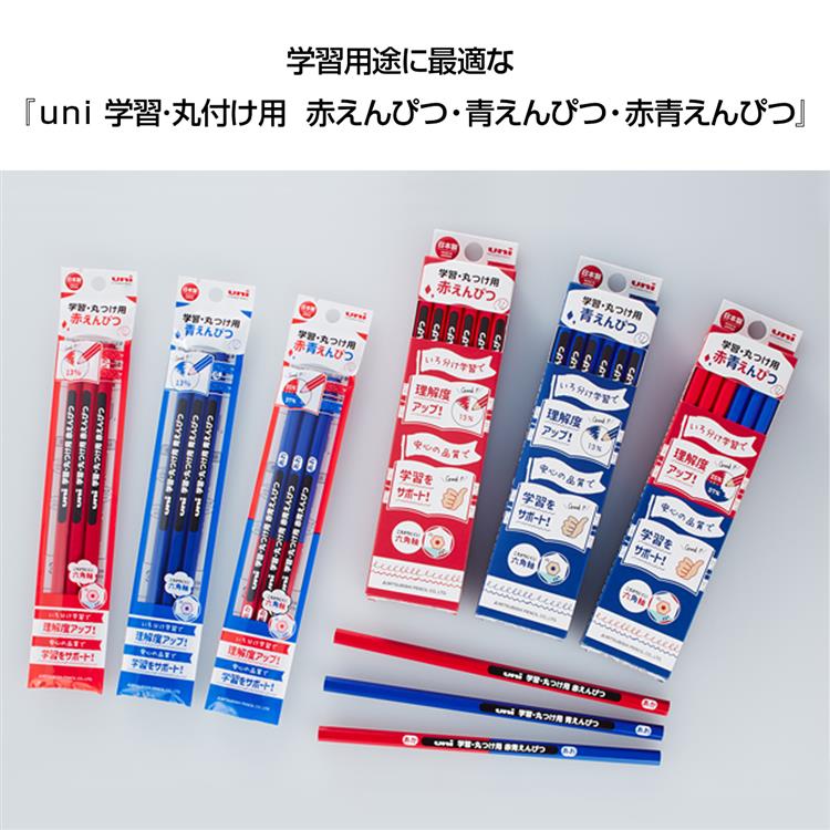 鉛筆の正しい持ち方の練習がしやすく、転がりにくいという利点がある六角軸を採用した赤鉛筆です。