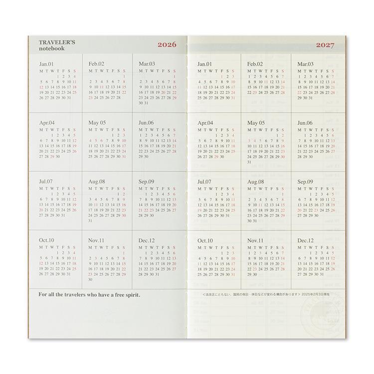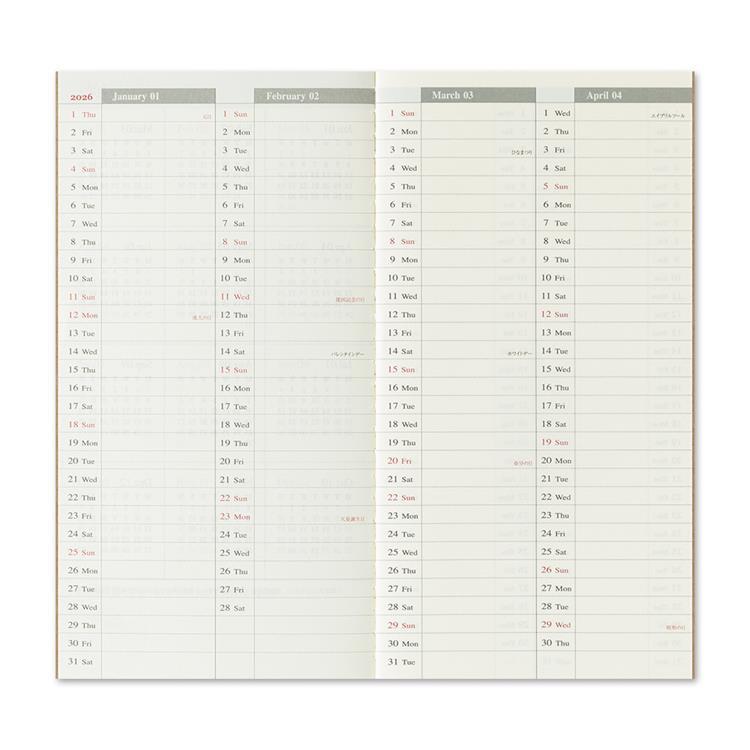 トラベラーズノートの週間フリー+メモの2026年ダイアリーリフィルです。