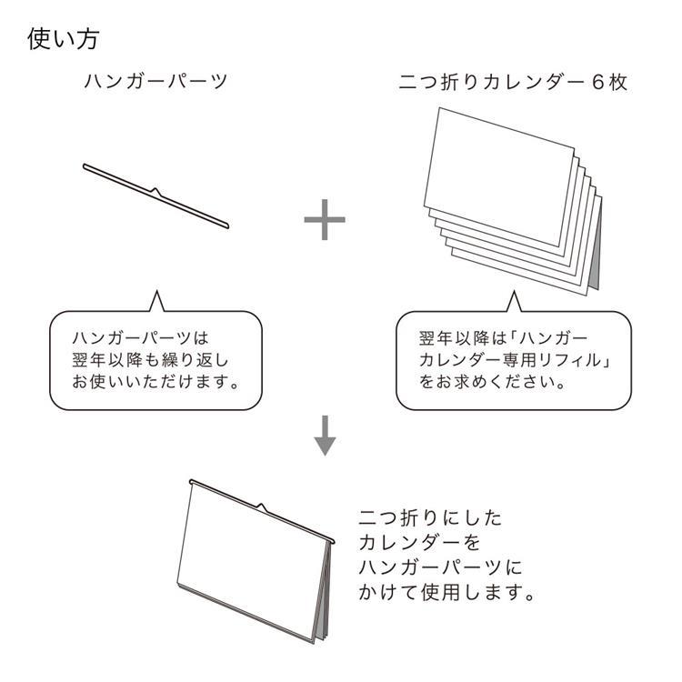 カレンダーが印刷された二つ折りの紙をハンガーパーツに掛けて使う壁掛けカレンダーです。