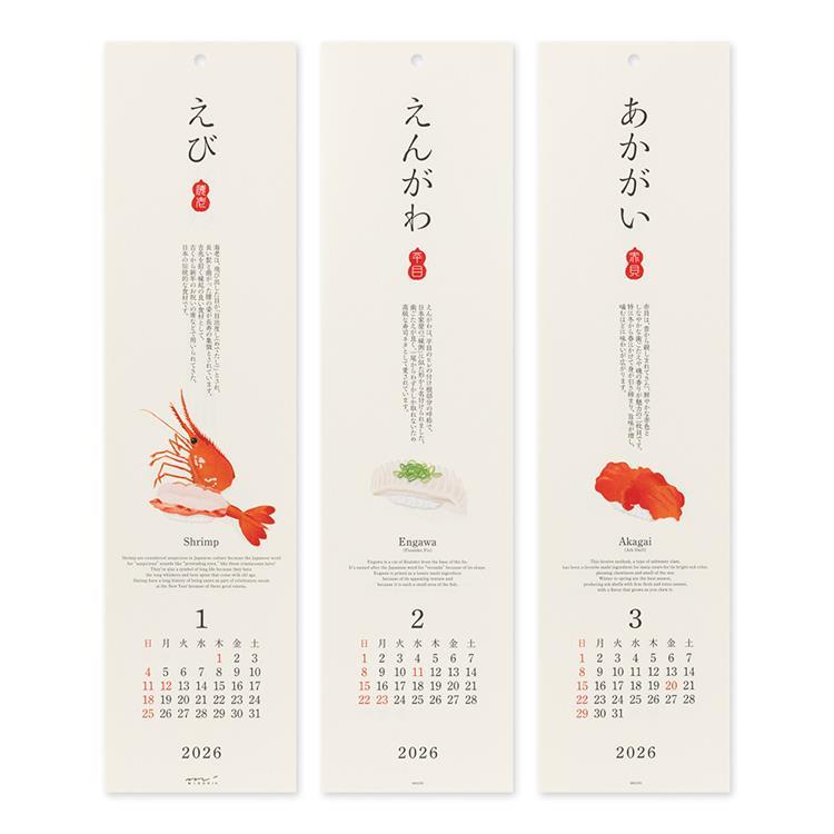 1000年以上もの長い歴史と伝統に育まれた「越前和紙」を使用し、鮮やかなオフセット印刷と、シルク印刷の質感を活かし、寿司を美しくデザインしたカレンダーです。