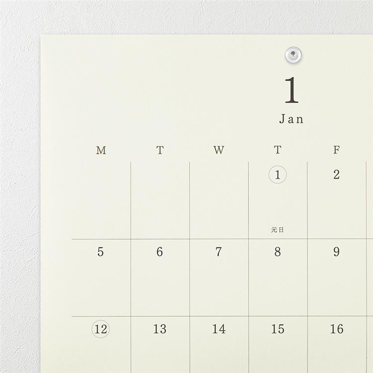 「MD用紙 厚口」を使用し、12ヵ月のカレンダーページだけで構成したミニマルなデザインのカレンダーです。
