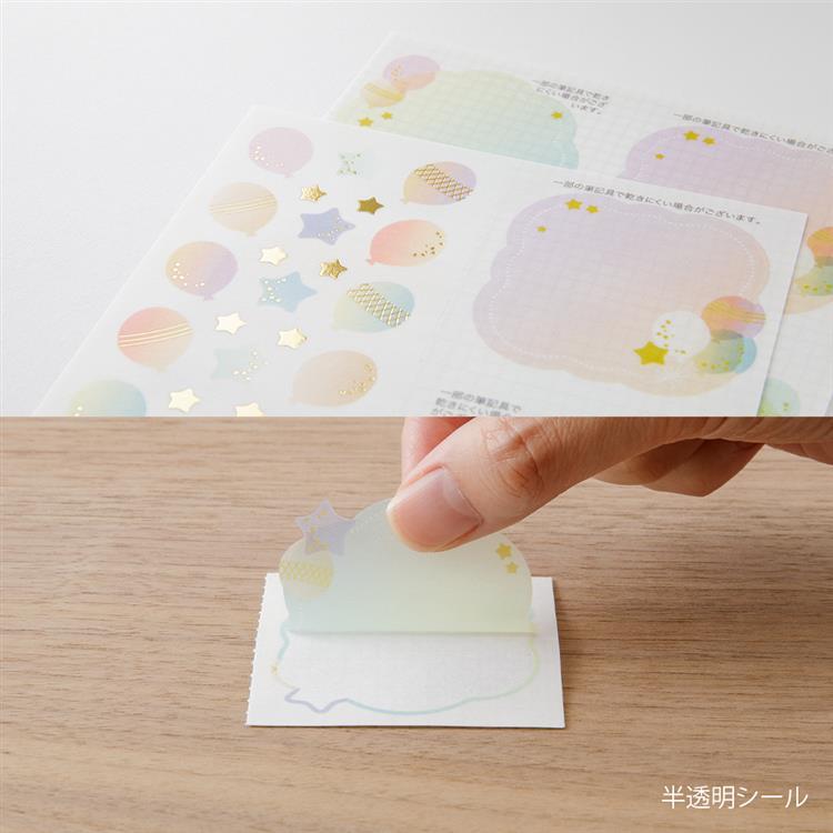 重ねて使える飾りシールがセットになった、半透明タイプの色紙用シールです。