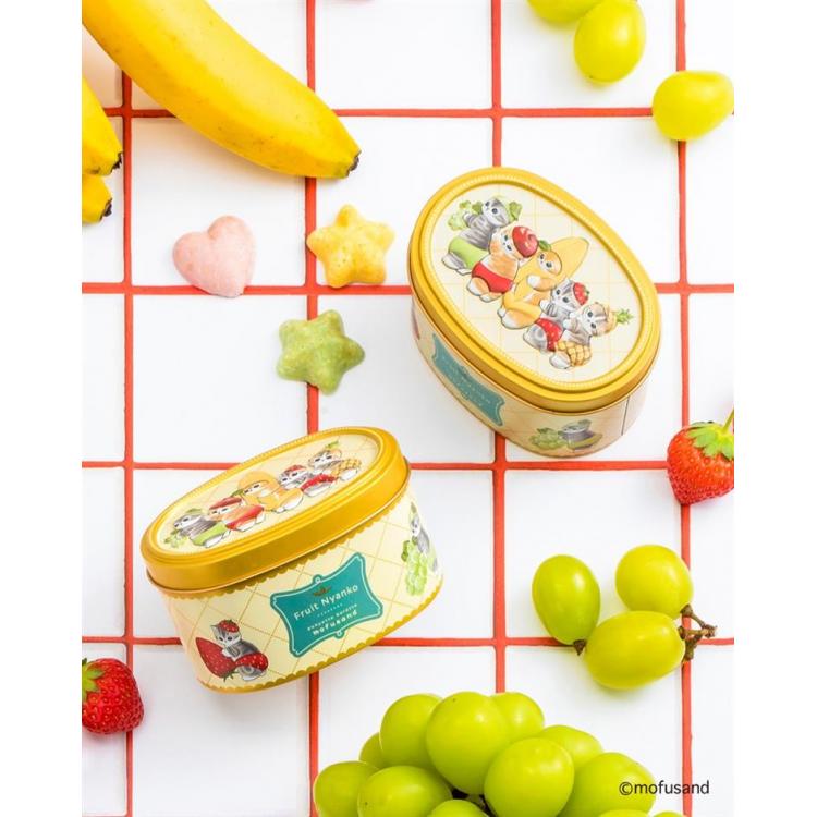 オーバル形のエンボス缶にフルーツ風味のクランチを3種類(いちご・マスカット・バナナ)アソートしました。