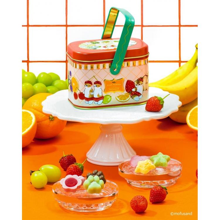 mofusandがデザインされたバスケット型のエンボス缶に、フルーツ風味(いちご・マスカット・バナナ)のグミチョコレートとクランチをアソートしました。