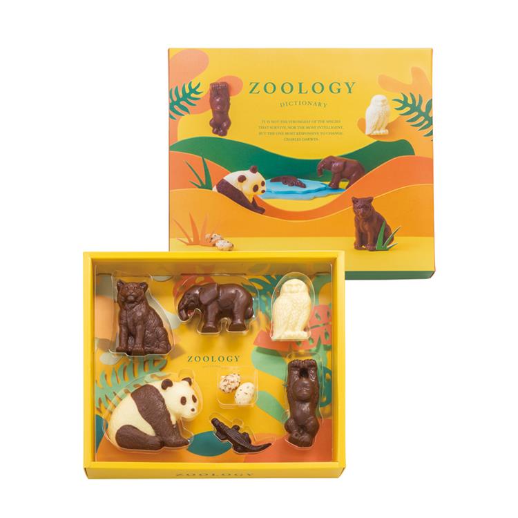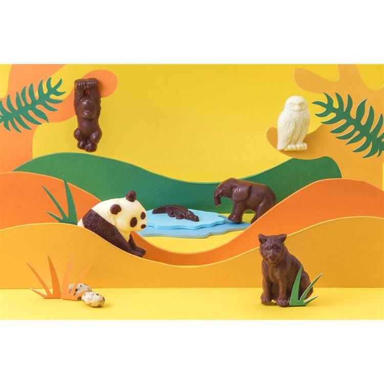 パンダ・トラ・ゾウ・シロフクロウ・オランウータン・コワニの6種類の動物とタマゴ型のチョコが図鑑のように並んだセットです。