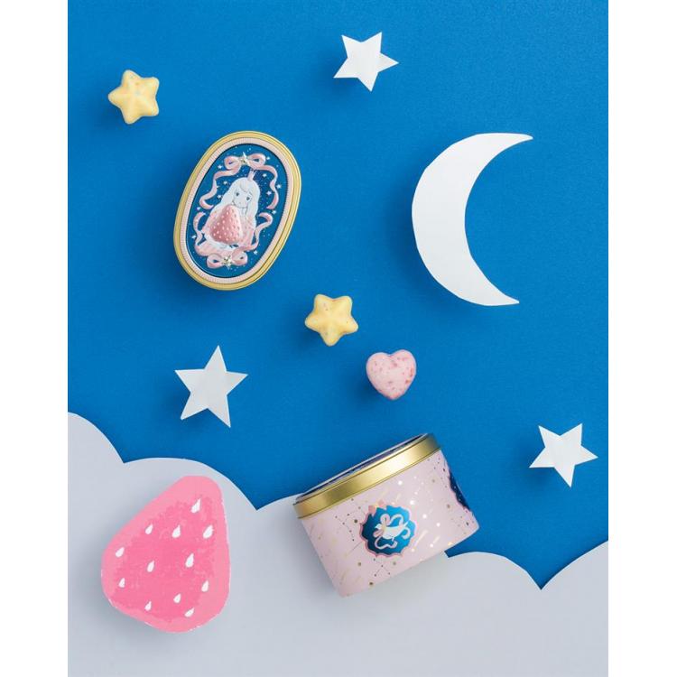 エンボス仕様の缶に、苺のフリーズドライが入ったチョコレートクランチとカラーミンツ入りのレモンフレーバーのクランチをアソートしました。