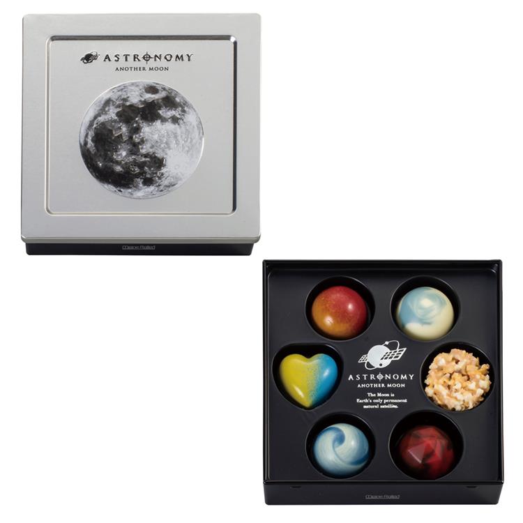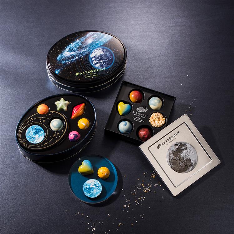 赤い月と青い月をイメージしたチョコレートをメインに、天体モチーフのチョコレートを詰め合わせました。