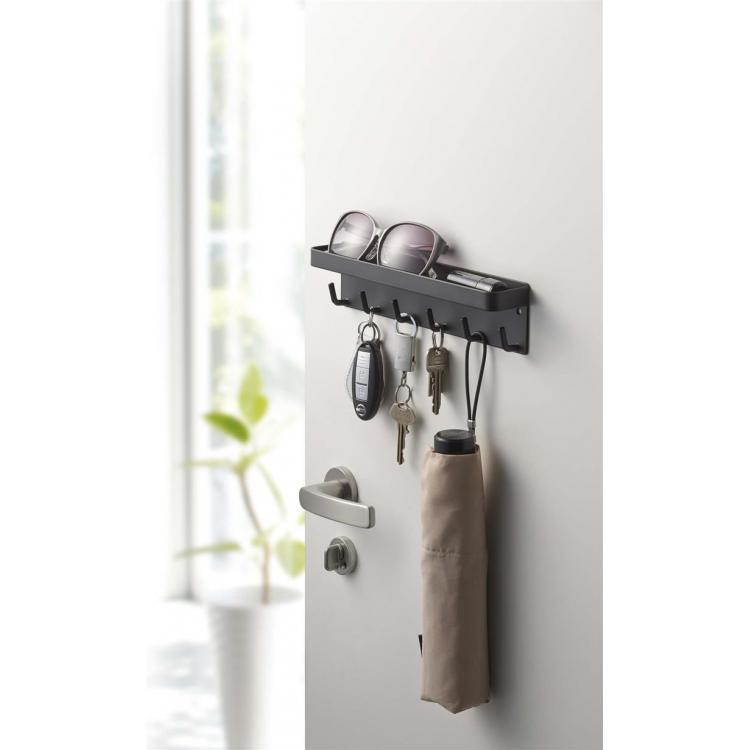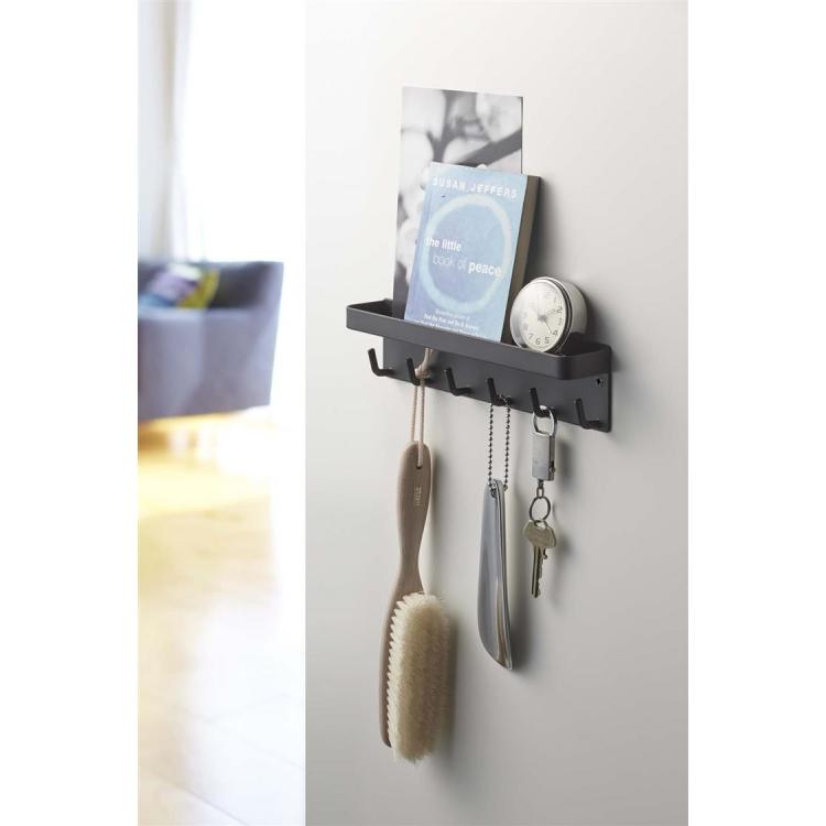 スチール壁面に磁石で簡単取り付けのキーフック&トレイ。トレイ付きで受時の印鑑やサインがスムーズに。壁に付ければ、ディスプレイ感覚で小物を魅せて収納。