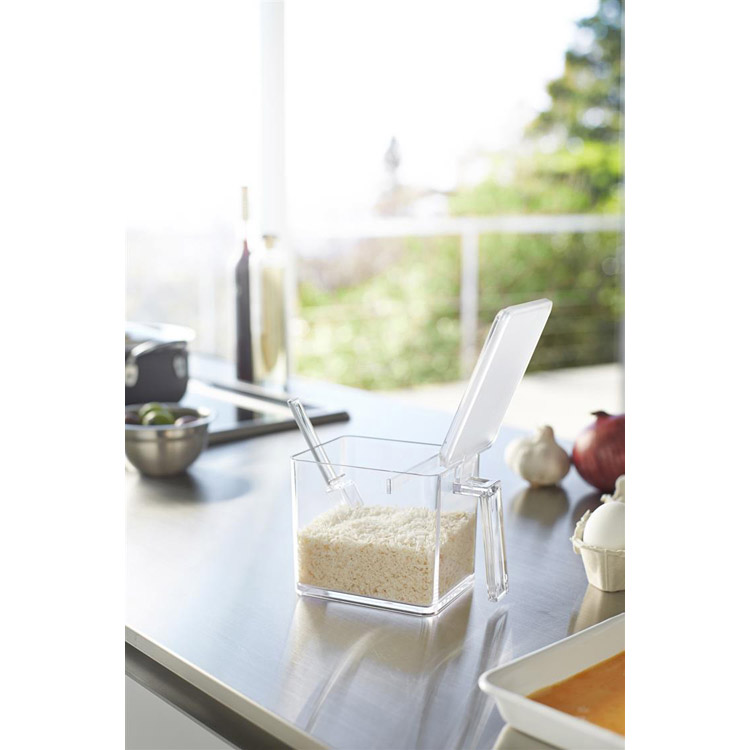 小さじ5mlがすり切れる調味料ストッカー。スミまですくいやすい容器の角は、洗いやすく、衛生的。パーツは全て分解して洗えるので、お手入れ簡単。