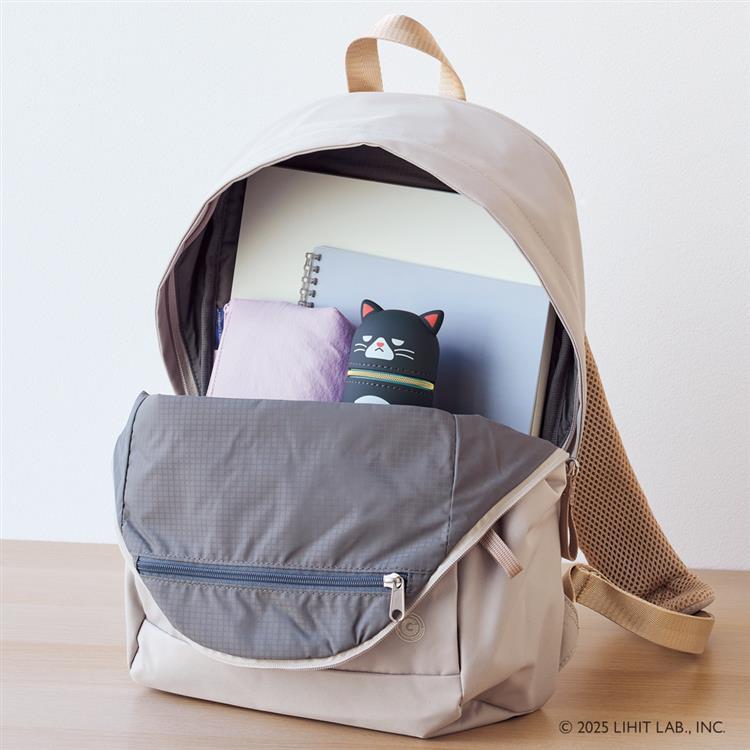 ファスナーを開けて本体を押し下げるとペンスタンドとして使用でき、フタ部分には消しゴムホルダーが付いてます。