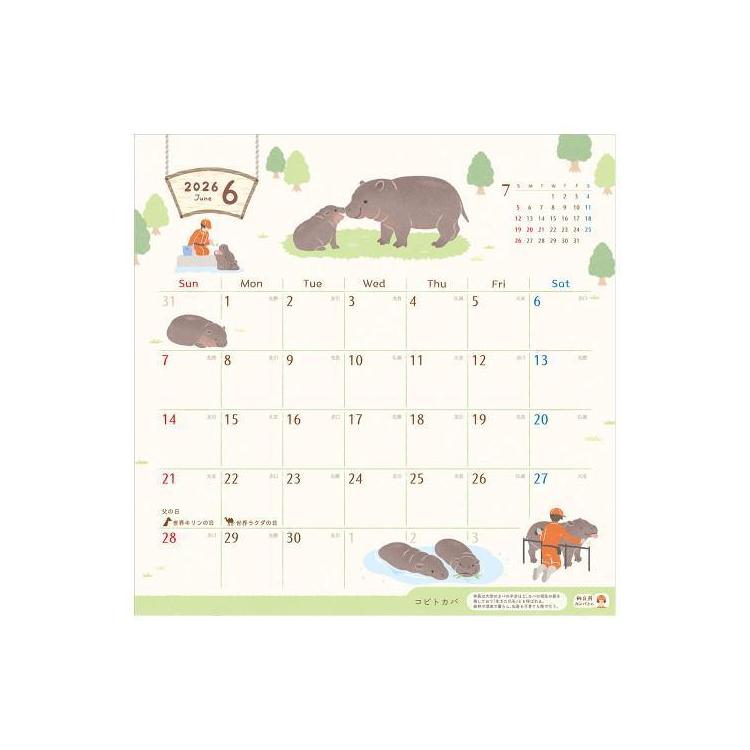 とある動物園で暮らす個性豊かな動物たちと、ときどき登場する飼育員さんにほっこりする壁掛けカレンダーです。