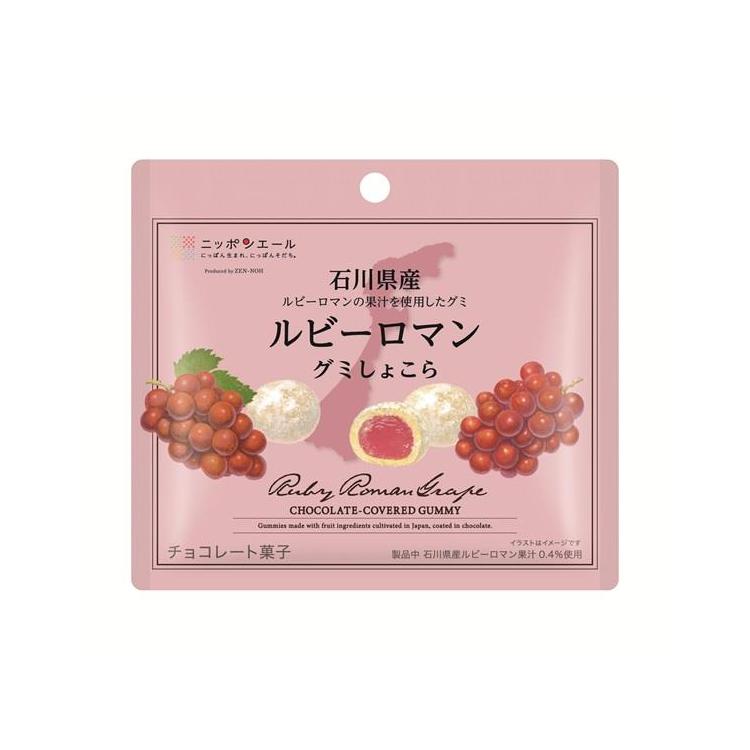 石川県のルビーロマン果汁を使用したグミをホワイトチョコレートでコーティングしました。