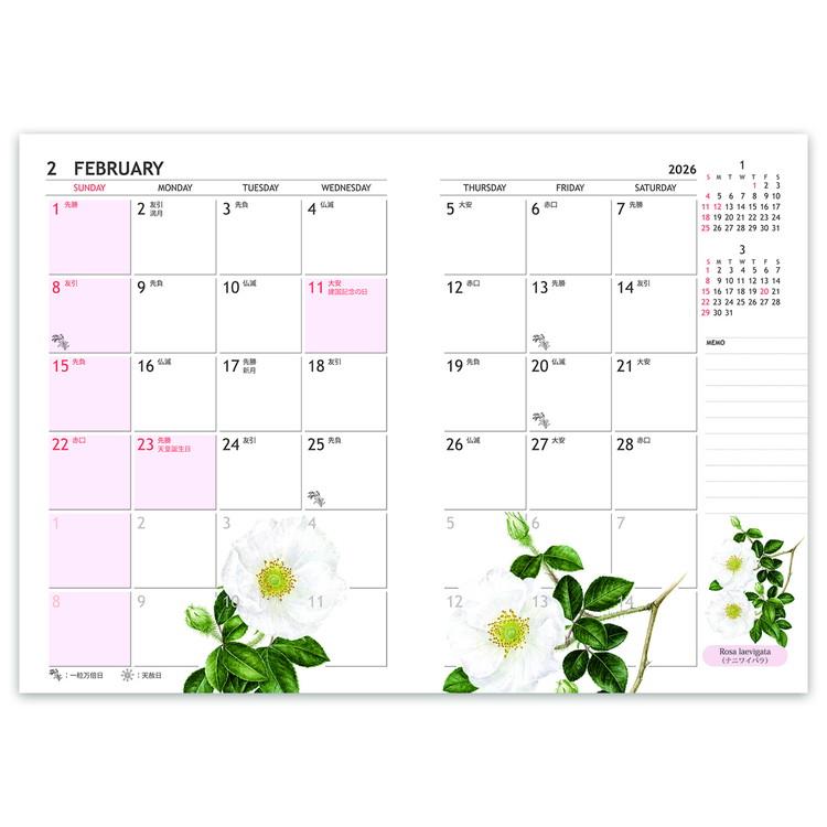 携帯して持ち歩くのに便利なA6サイズ。オールカラー。月間ブロックタイプ。日曜日始まり。六曜入り。前年12月から翌年3月までの16か月掲載。年間スケジュール、年齢早見表、ヘルスチェックカレンダー、度量衝換算表、時差表などの付録ページも充実しています。