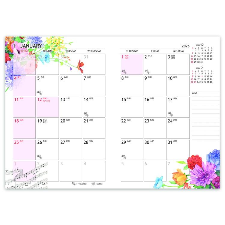 携帯して持ち歩くのに便利なA6サイズ。オールカラー。月間ブロックタイプ。日曜日始まり。六曜入り。前年12月から翌年3月までの16か月掲載。年間スケジュール、年齢早見表、ヘルスチェックカレンダー、度量衝換算表、時差表などの付録ページも充実しています。