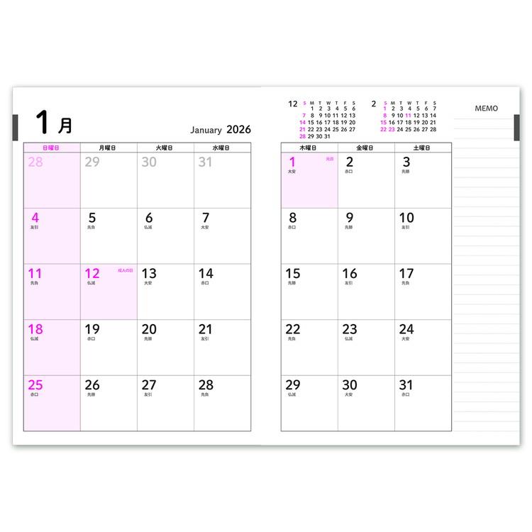 B5版サイズ・日曜始まり・マンスリー・前年12月から今年12月まで。付録ページはパーソナルデータ・かかりつけ医院アドレス帳・毎月の記録・メモ。日曜日始まり。六曜入り。