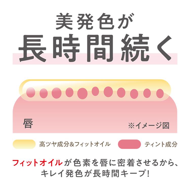 フィットオイルが色素を唇にピタっと密着させ、塗りたてのきれいな発色を長時間キープ。
