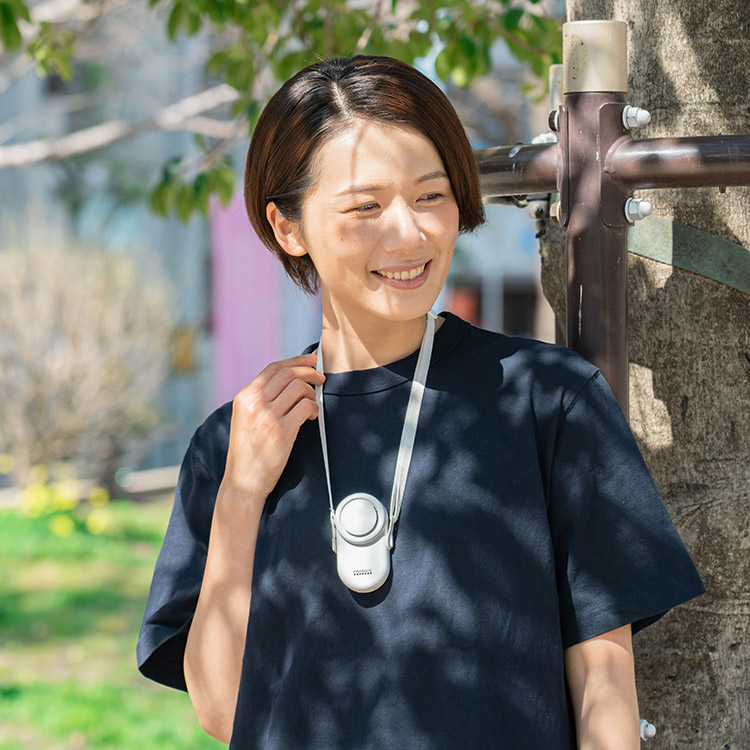 付属のネックストラップを使用して、本体を首から下げつつ服の中に直接、送風することもできます。