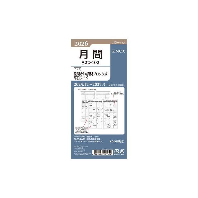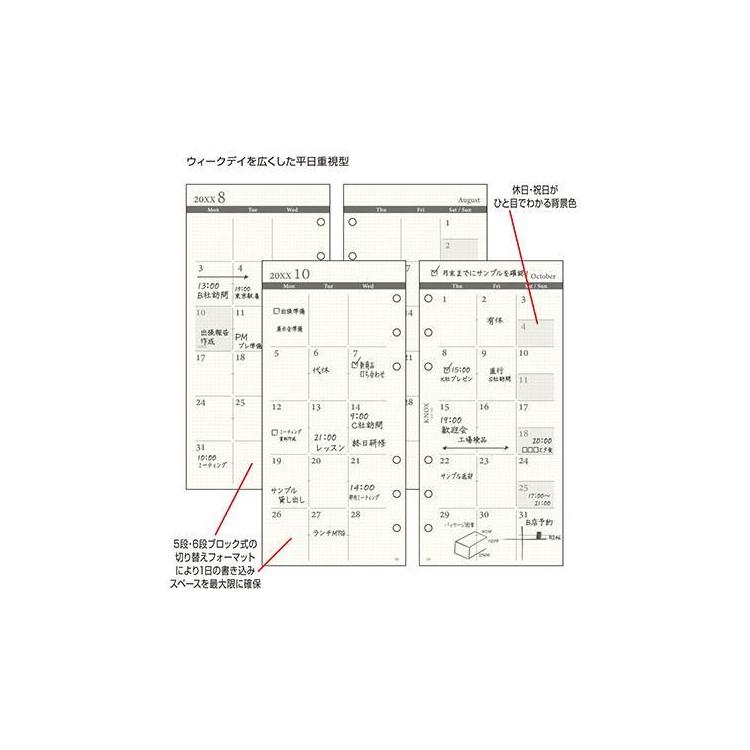 - 2026年1月始まりシステム手帳用リフィル ナロー 月間 ブロック 平日ワイド