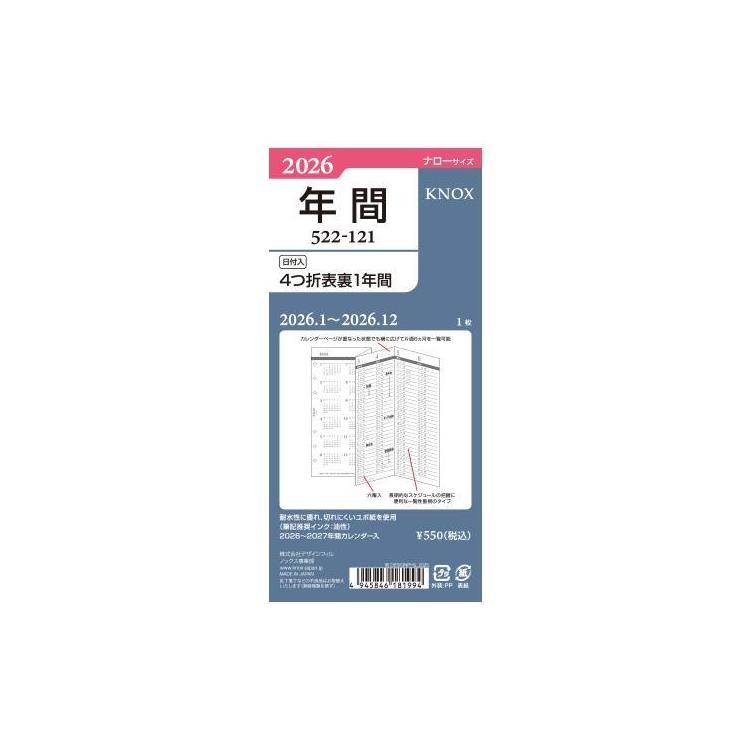 - 2026年1月始まりシステム手帳用リフィル ナロー 4つ折り表裏1年間 日付入り