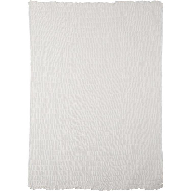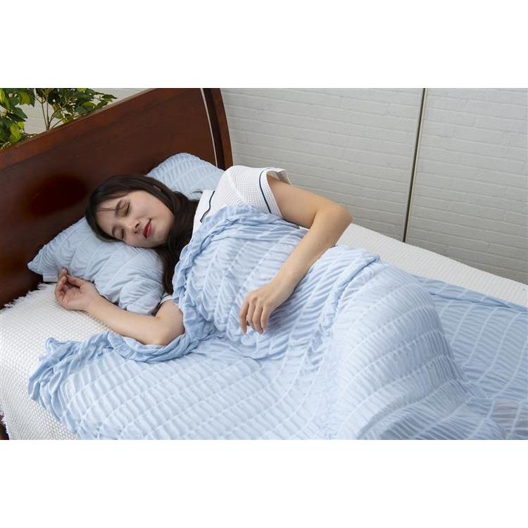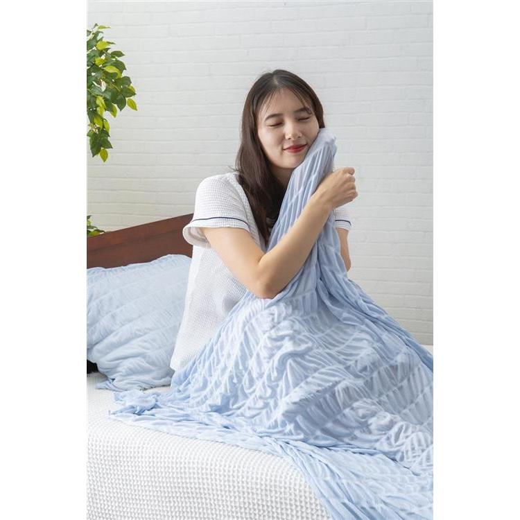 細かいギャザーを編み込んだ生地がサラサラしてべたつかず、やわらかい肌触りのタオルケット。