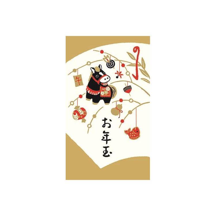 おめでたい雰囲気のあるお正月モチーフとおもちゃの馬が描かれたお年玉袋です。