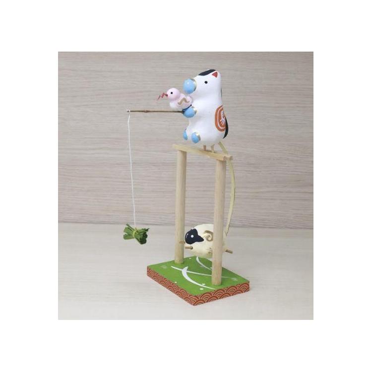 縁起の良い午と前年の干支である巳が牧草を垂らし、次年の羊を釣ろうとするユニークで愛らしいやじろべえです。