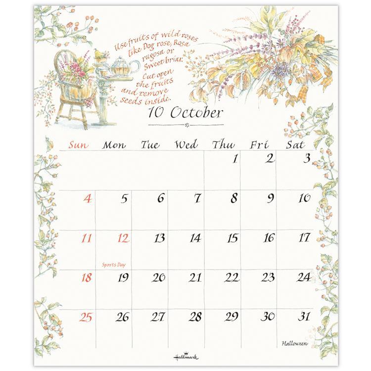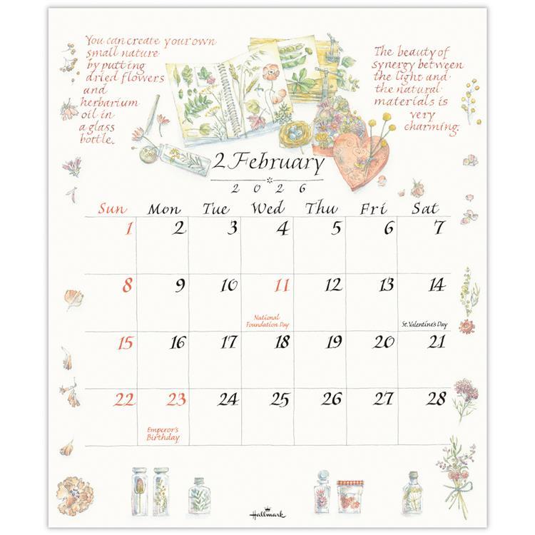 四季折々のハーブとカリグラフィーを描いた繊細で美しいデザイン。省スペースがうれしい、小さなサイズの壁掛けタイプです。台紙にスタンドが付いているので卓上カレンダーとしてもお使いいただけます。