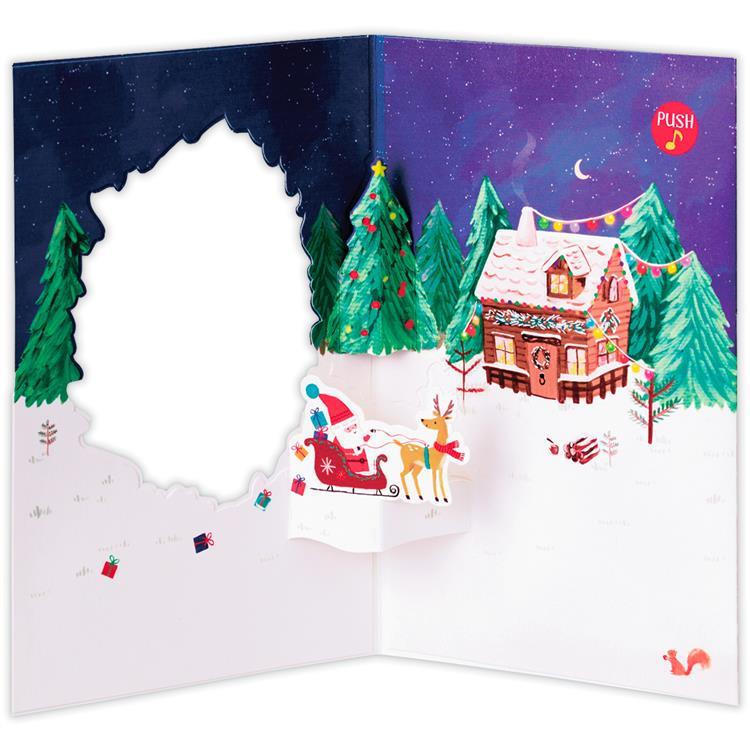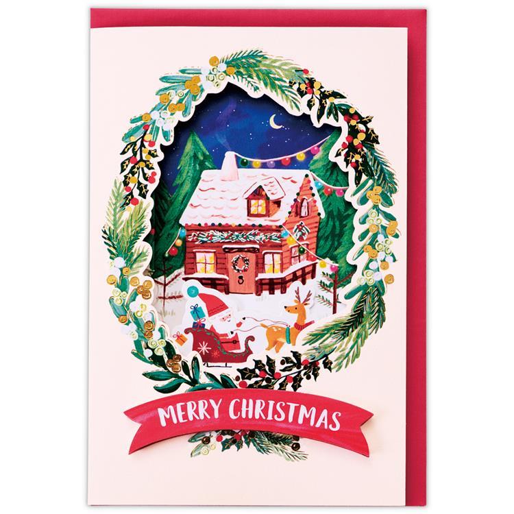 大きくくり抜かれたリース型の窓から、そりに乗ったサンタクロースや森の中のおうちが見える心温まるデザイン。