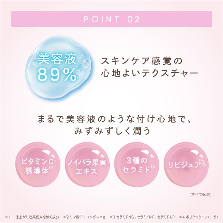 スキンケア感覚のみずみずしいテクスチャーでしっとりとお肌に溶け込みます。