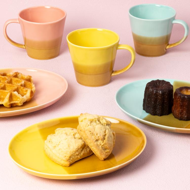 ピンク、ブルー、イエロー…それぞれ異なる色をまといながら、共通のフォルムと質感で揃えた器たちは、まるで性格の違うふたりが寄り添うよう。