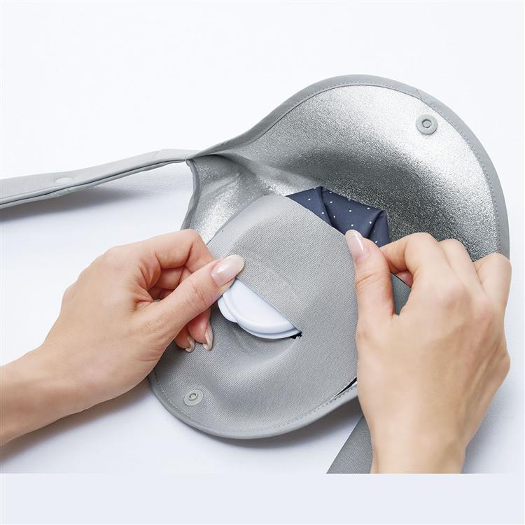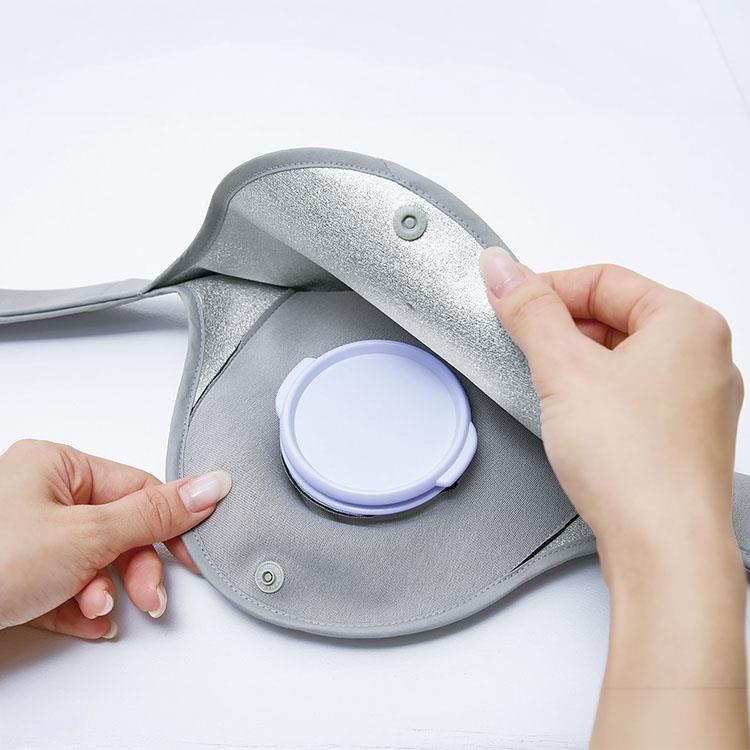 - 1.ホックを外しポケットのカバーを上げます。氷のうをポケットに入れ、スリットから氷のうのフタ部分を引っ張り出します。