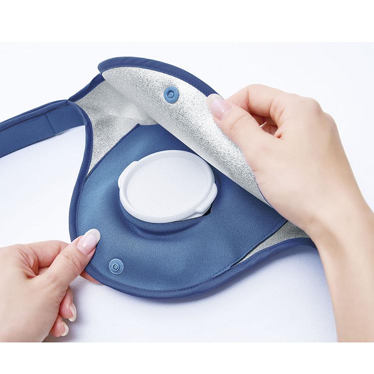 - 1.ホックを外しポケットのカバーを上げます。氷のうをポケットに入れ、スリットから氷のうのフタ部分を引っ張り出します。
