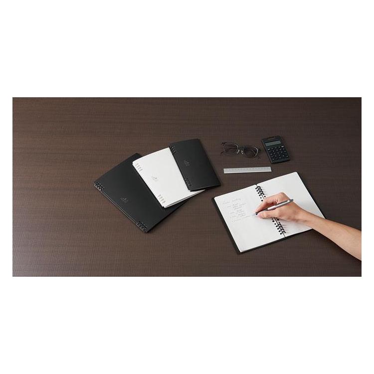 独自開発の上下セパレート式リングを採用。リングが手に触れないから書きやすい。リングノートなのにリングが開閉。リーフの差替え・追加が可能。市販のルーズリーフが使用できる。従来のリングノート同様表紙を360°折り返せるから、スペースをとらずコンパクト。