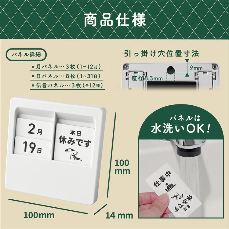 - 月パネル(3枚)、日パネル(8枚)、伝言パネル(3枚)