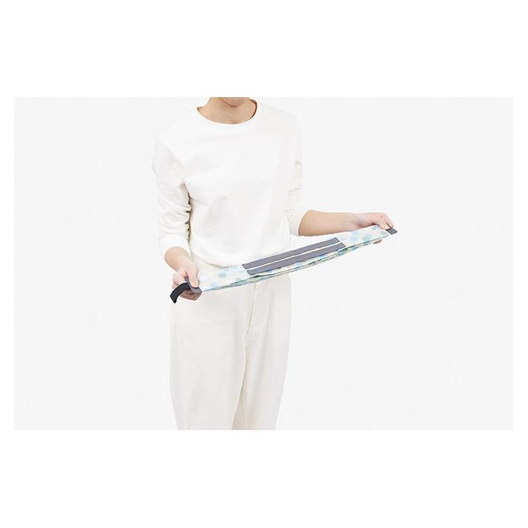・両端を引っぱると一気に帯状に。あとは2回半分に折って丸めるだけでたためます。