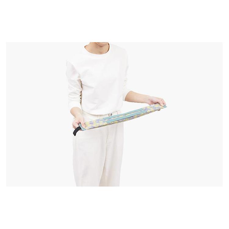 ・両端を引っぱると一気に帯状に。あとは2回半分に折って丸めるだけでたためます。