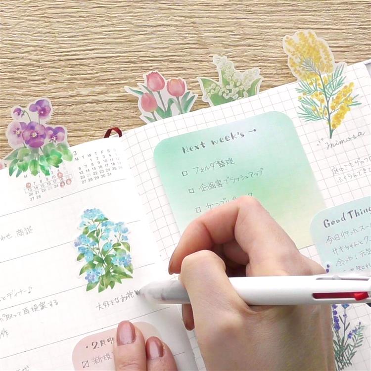 本や手帳の上部分にページから飛び出すように貼ると、まるでデスク周りが花咲く庭に変わるフィルムふせん「Tale Gardens」。