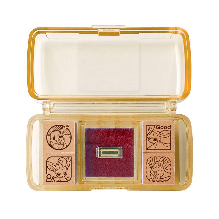 4個の木製スタンプとインクパッドをケースにまとめた、持ち運び便利なスタンプセット。