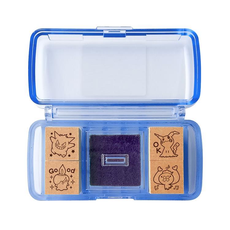 4個の木製スタンプとインクパッドをケースにまとめた、持ち運び便利なスタンプセット。