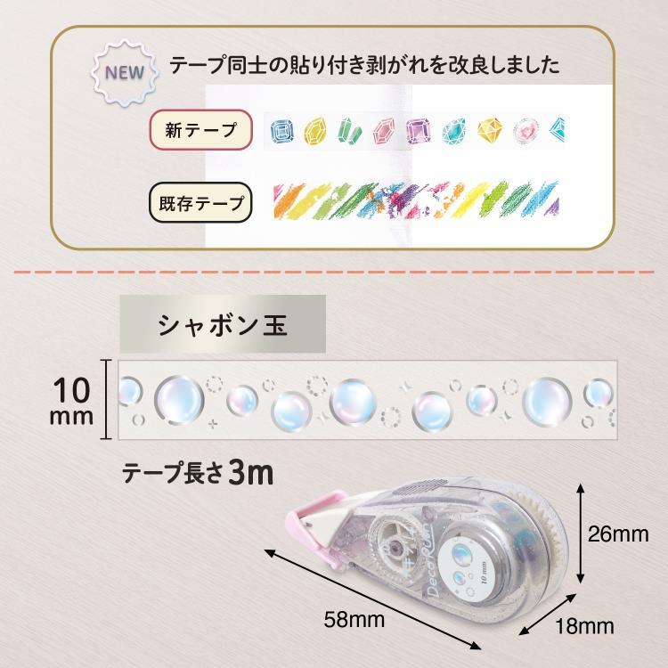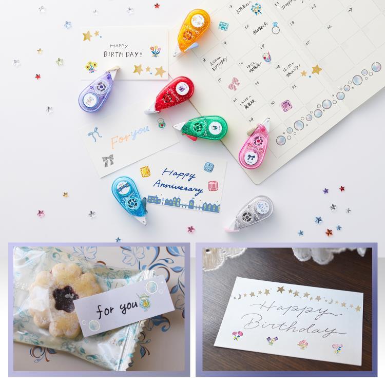 指1本で自動開閉可能な「ワンタッチキャップ」や、なめらかな使い心地を実現する「ミニローラー」、 テープ浮きを防ぎ密着性を高める「ピタッとヘッド」など、各種機能も抜群に優れた数量限定デコレーションアイテムです。