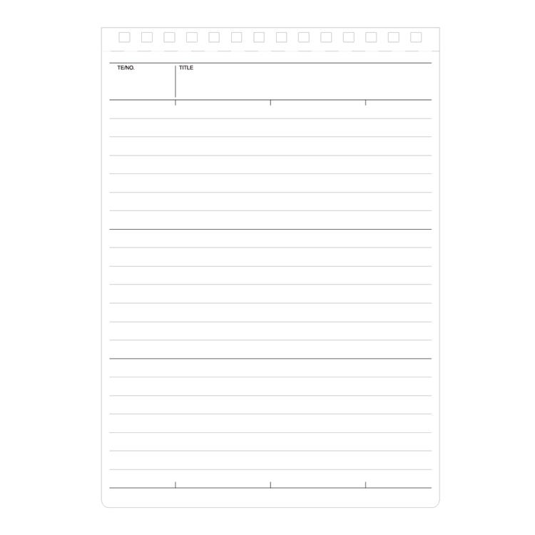 用紙の厚みでペンや鉛筆が沈んで書きにくいということを防ぐために、用紙の枚数も50枚に抑えました。立って人と話しながら使用することを想定しているため、ノートを持ったままページをめくれるように、リングを上辺に配置し縦開きとしました。立ったままの商談や取材でも、筆記作業が途切れることなくスムーズにページをめくれます。