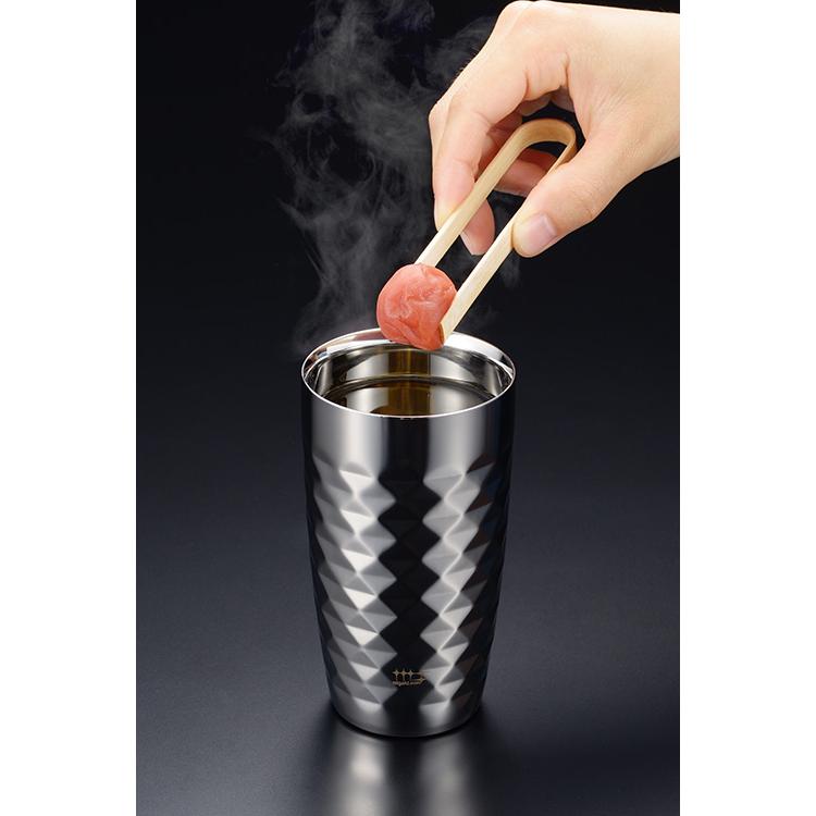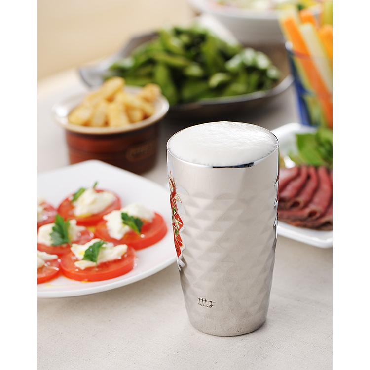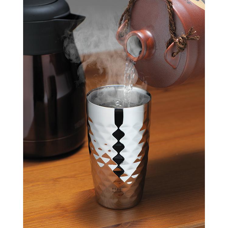 冷たいものを注いでも水滴がつきにくく、熱も伝わりにくい2重構造。ビールはもちろん、焼酎などお湯割りでも楽しめます。