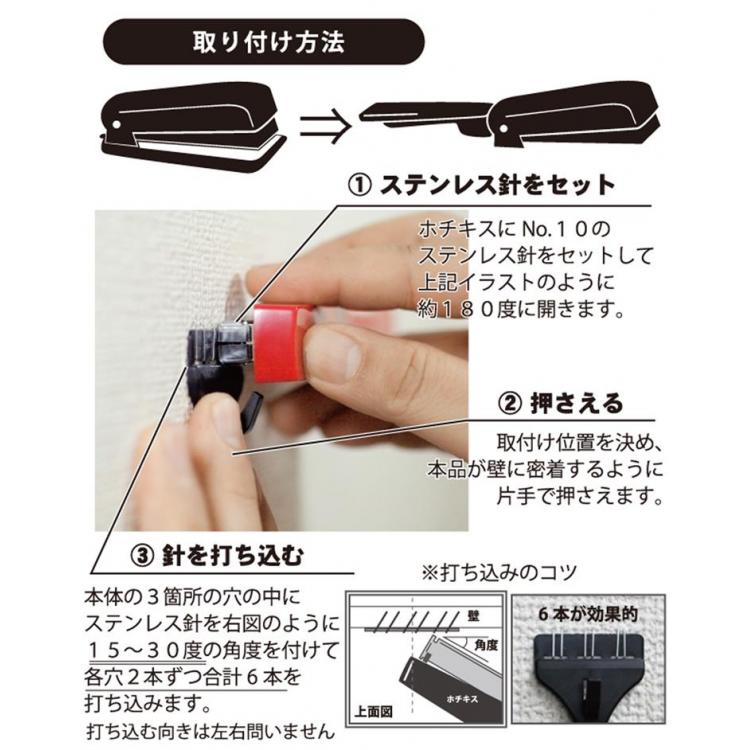 - 石膏ボード&柔らかい木部用 堅い木材やコンクリートなどでのご使用は避けてください。必ずステンレス針を使用してください。物を掛けたり外したりするときは衝撃を与えないようできるだけ、静かに垂直に行ってください。 針が浮いてないか定期的に確認してください。