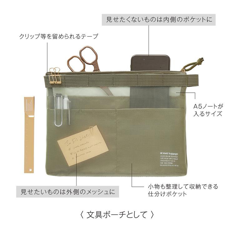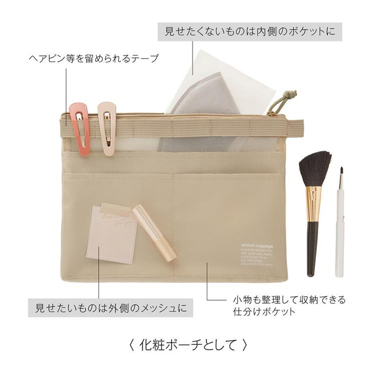 中身が瞬時に確認でき、整理整頓に役立つメッシュポーチです。
